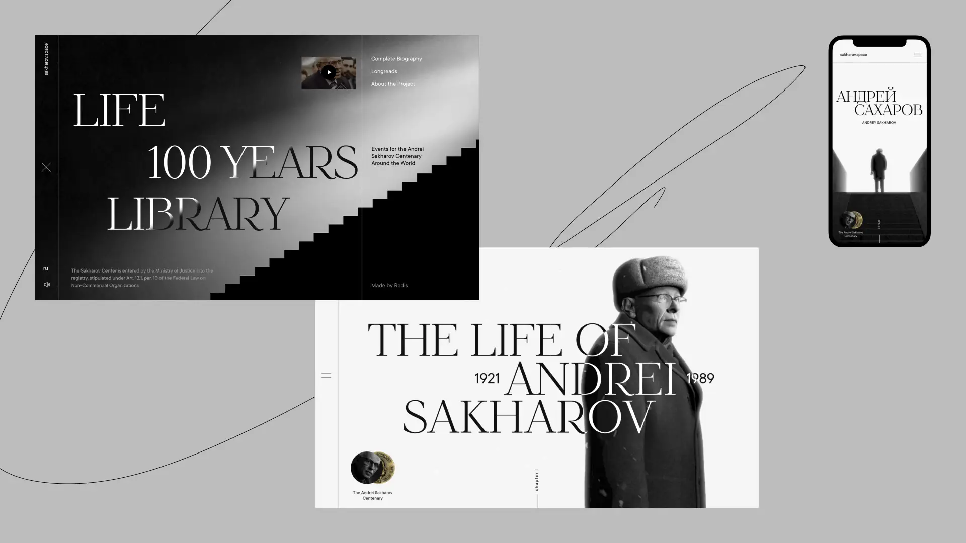 После Бориса Игнатовича, мы сделали Sakharov.space — сайт, посвященный 100-летию великого ученого и гуманиста Андрея Сахарова. Этот масштабный проект, созданный совместно с «Сахаровским центром» (организация признана иностранным агентом), влюбил в себя и команду, и пользователей, и жюри всех наград от Awwwards до фестиваля социальных проектов The Anthem Awards от Webby.